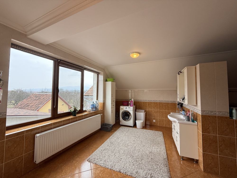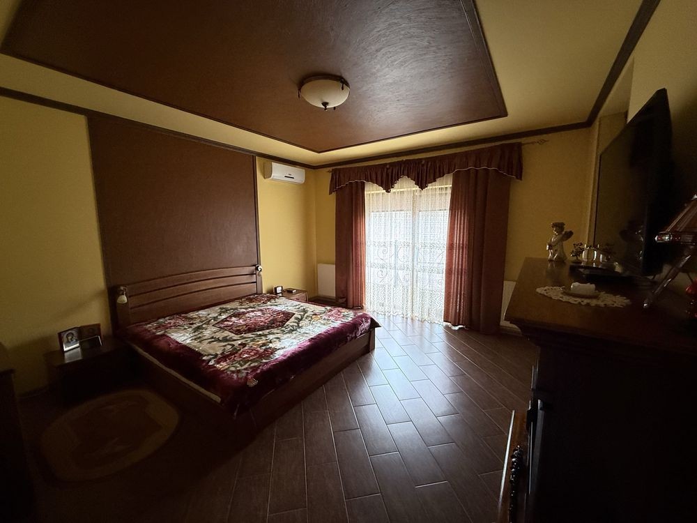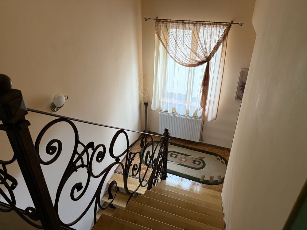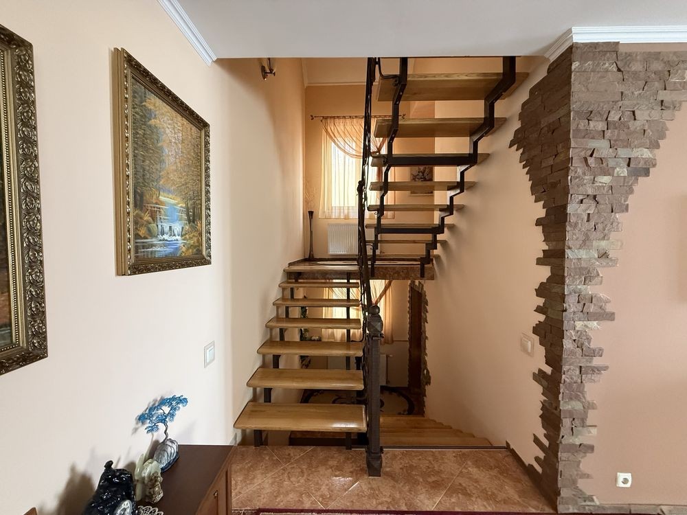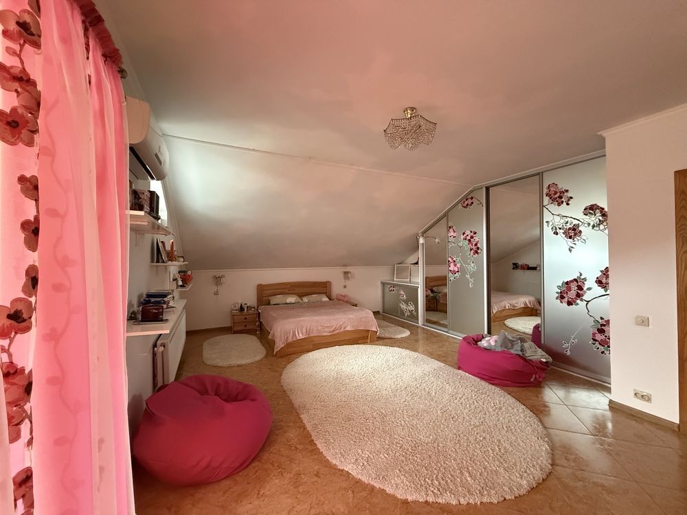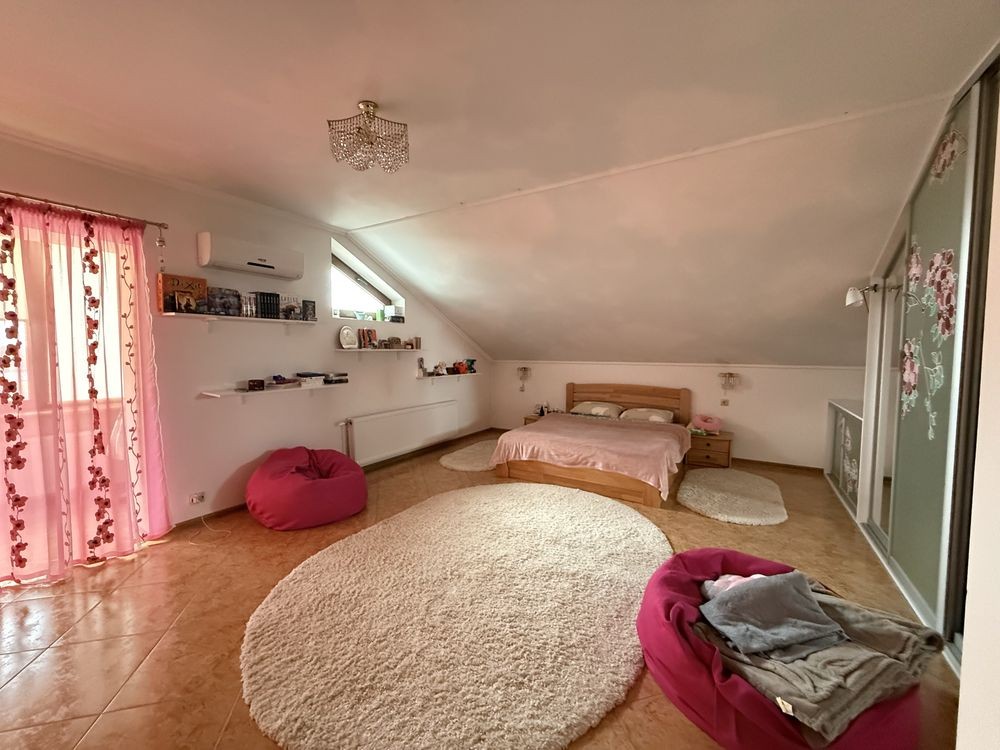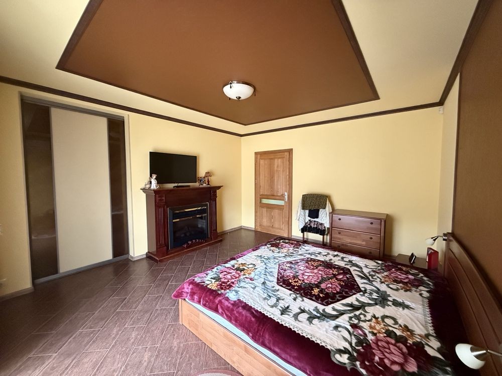 • 5 кімнат, площа 301 м², просторий та затишний. 2 поверхи. Перший поверх студія поділена на секції вітальня/столова та кухня. Одна гостьова кімната між поверхами та 2 поверх дві спальні + ванна кімната. На цокольному поверсі санвузол з душем та гардеробна.