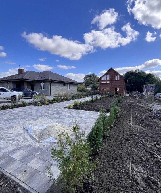 Посаджені декоративні дерева та кущі, по всьому периметру ділянки положена бруківка .