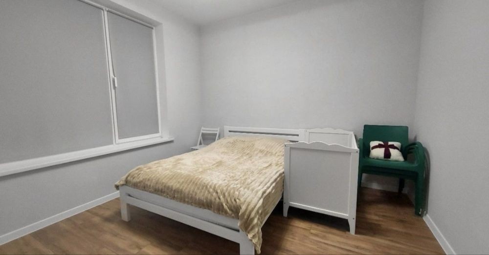 • другий поверх - підлога ламінат, стіни - шпалери, велике двоспальне ліжко з нішею для зберігання речей, великий робочий стіл, крісло офісне