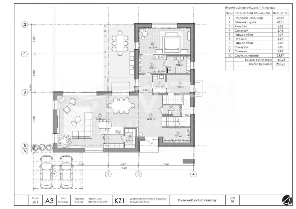 1 поверх: кухня-вітальня, майстер-спальня з гардеробною та ванною кімнатою, побутова кімната, гардеробна, санвузол, топочна