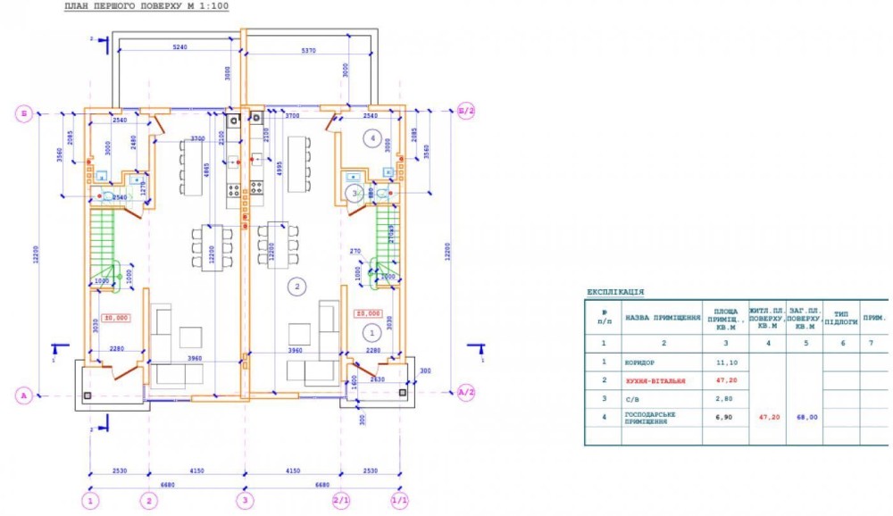 Загальна площа будинку - 140 м2, житлова - 48.7 м2, кухня - 47.2 м2.