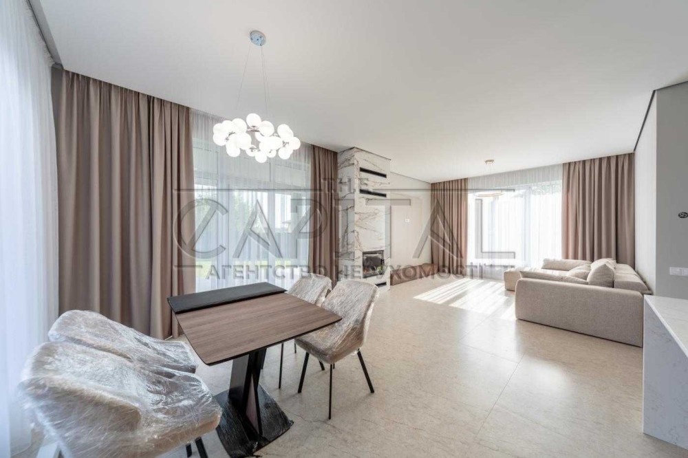 Вас вітає затишок та комфорт заміського життя — чудовий будинок площею 195 м² із ремонтом, каміном та водяним опаленням, розташований у закритому котеджному містечку в селі Ходосівка, всього за кілька хвилин від Києва.