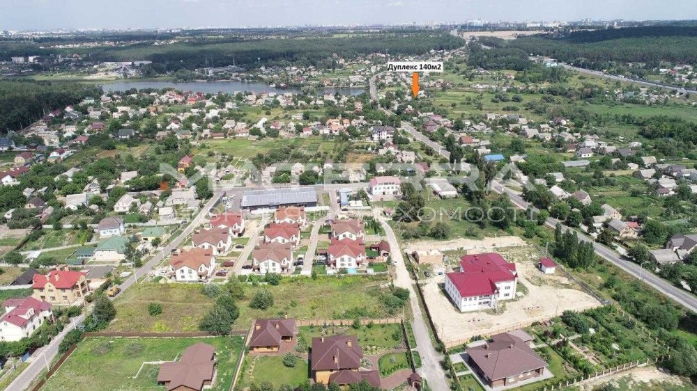Сучасний двоповерховий дуплекс площею 140 м² з гаражем і земельною ділянкою 3 сотки розташований у мальовничому селі, оточеному лісом. Тиха, екологічно чиста місцевість із зручним доїздом до Києва. Поруч — озеро, магазини, школа, дитячий садок.
