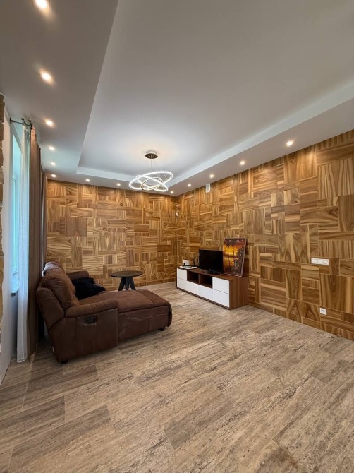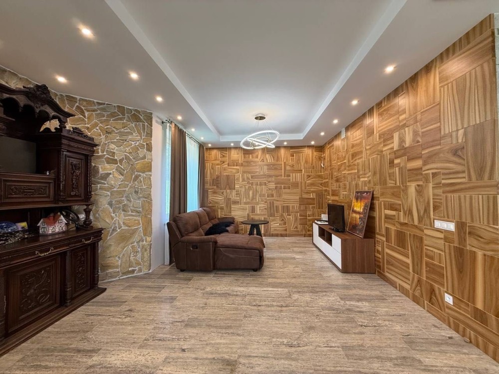 - У вітальній натуральний Болгарський камінь "золотий", декоративні стінові панелі з горіху