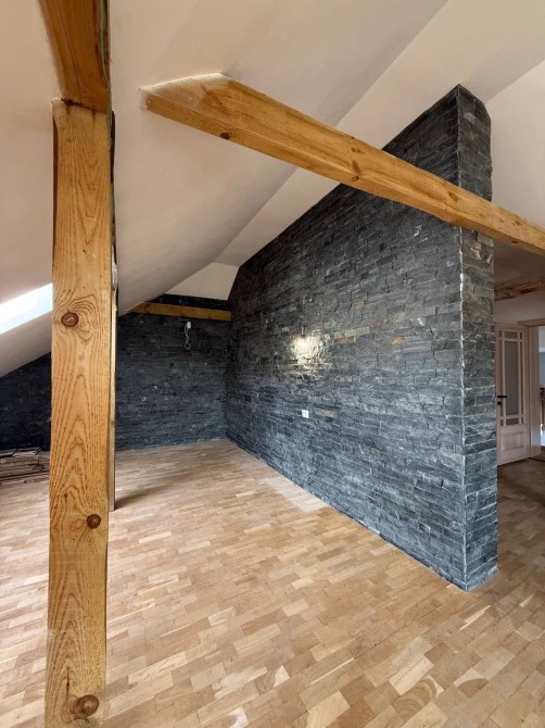 Мансарда - паркет масив дуба та стіни із натурального Болгарського каменю "смарагд"