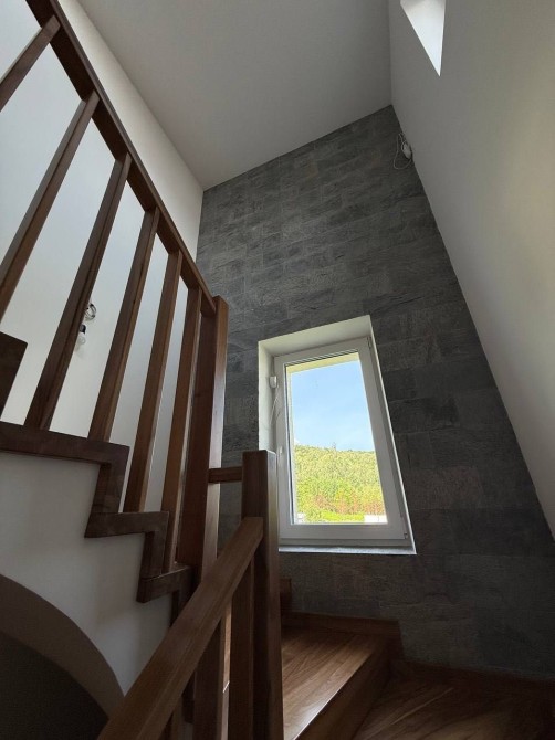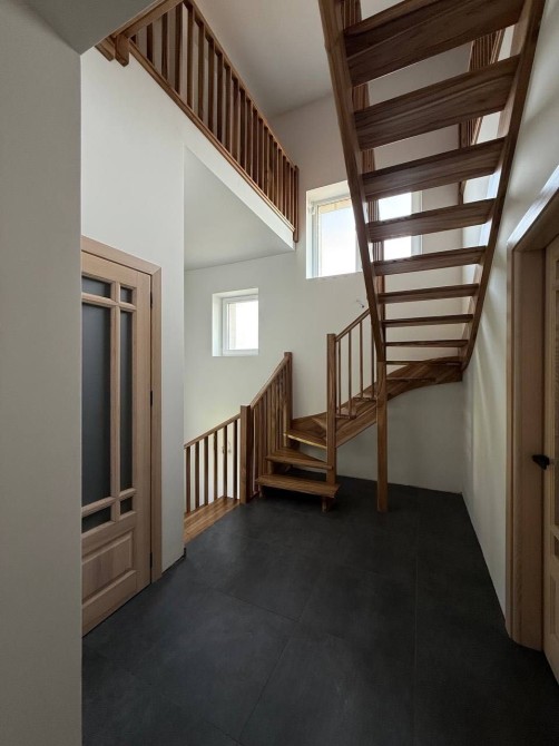 Сходи з першого на другий поверх - бетонні, обшиті інженерною дошкою з ламелю горіха, з другого на мансарду - масив горіха