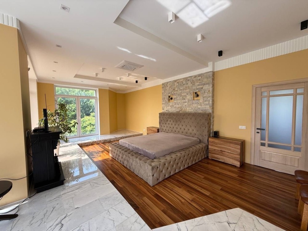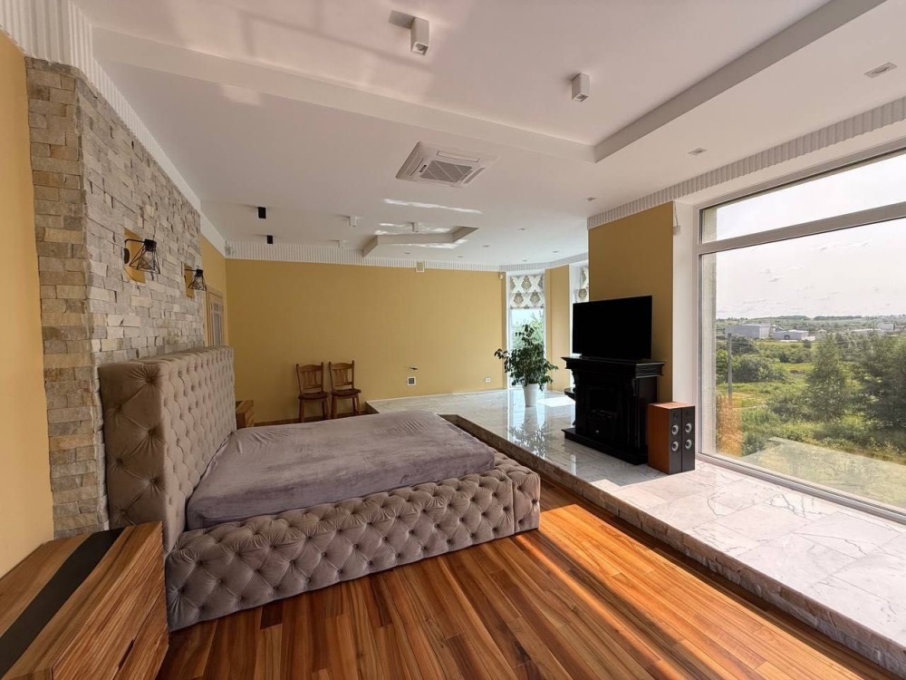 - У спальній - натуральний камін мрамур та інженерна дошка горіх, панорамні вікна