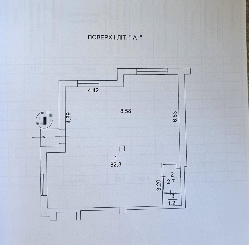 Основне приміщення - 82.7 кв.м, санвузол - 4 кв.м.