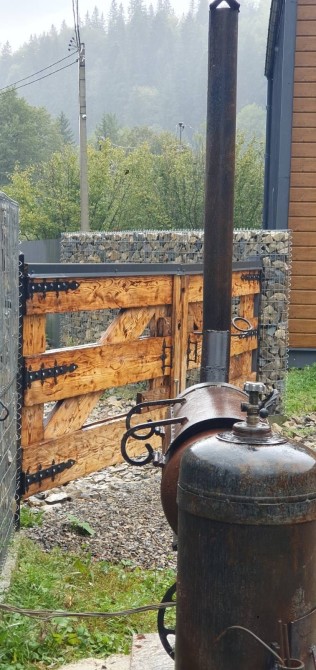 Брами авторського дизайну. Паркан - сучасний, виконаний по технології "Габіон".Ділянка рівна та висипана, закладена каналізація, водопровід свердловина. Електромережа на 30 кВт, генератор на 7 кВт, окрема розподільча електрощитова, Сонячна станція резервна. На території комплексу є джерело з цілющою карпатською водою. Без благоустрою.