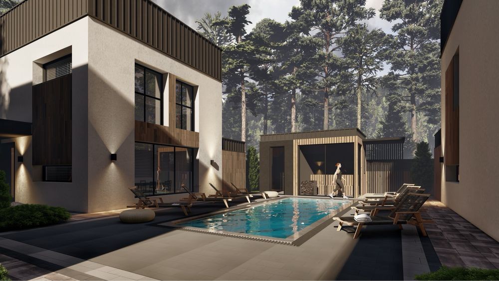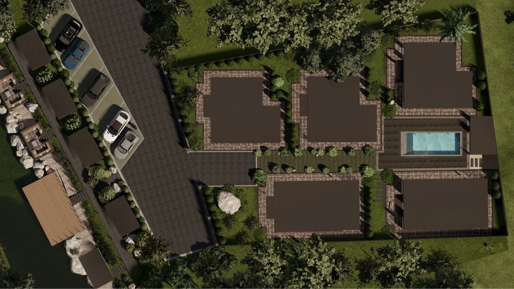 На території 5 котеджів ,басейн , сауна, на березі річки кожен власник будинку має свою альтанку з мангалом та площа над водою загольного користування