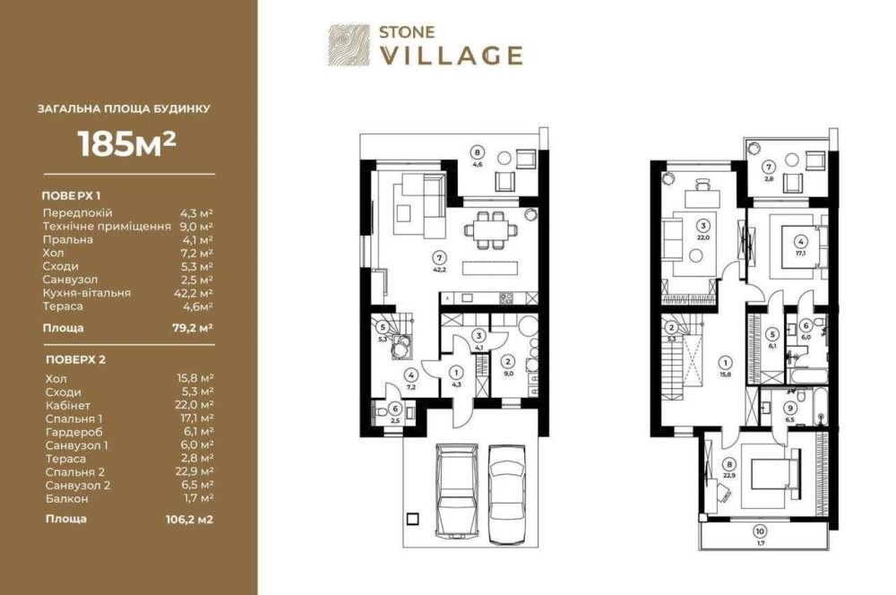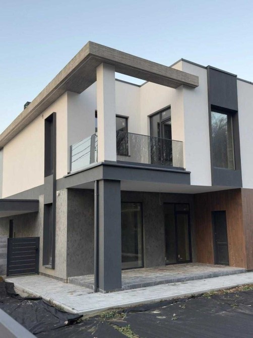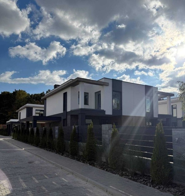 Будинок площею 185 м², двоповерховий, із продуманим сімейним плануванням. На першому поверсі — простора кухня-вітальня понад 40 м² з виходом на терасу, технічні приміщення, пральня та санвузол. Другий поверх передбачає приватну зону: три спальні, кабінет, гардероб та два санвузли, а також терасу і балкон.