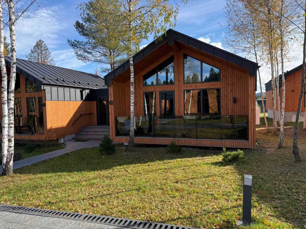 Котедж площею 43 м2, панорамні вікна, сучасний ремонт, меблі, техніку й усе необхідне для комфортного проживання гостей. На території — земельна ділянка 2 сотки.