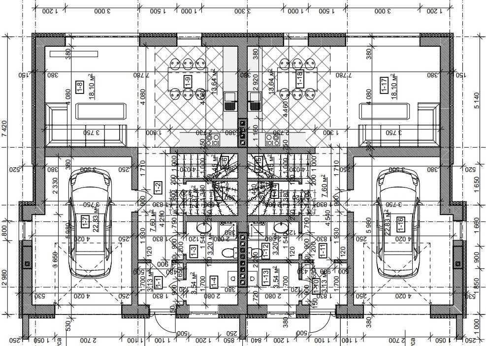 • 1-й поверх: кухня-вітальня 32 м² із виходом на терасу, гараж 23 м², гостьовий санвузол, технічне приміщення