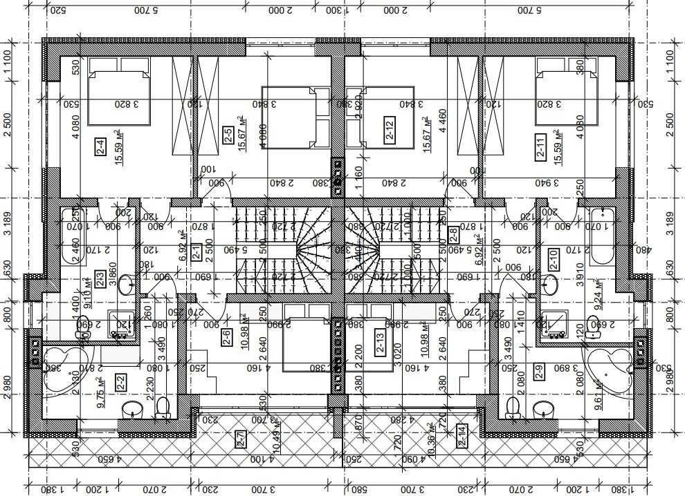 • 2-й поверх: open-space на три спальні 15.6/15.6/11.0 м² із великим балконом 10.4 м², два санвузли 9.8/9.1 м²