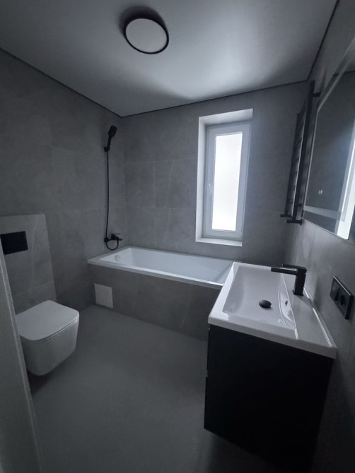 • Стильний санвузол у сучасному кахлі з новою сантехнікою.