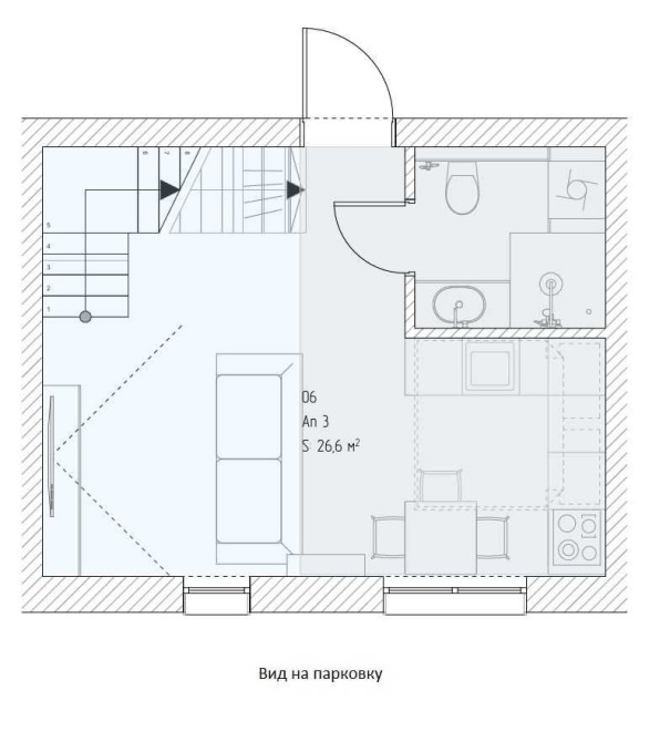 На першому поверсі (26,6 м²) розміщені вітальня з кухнею-студією та санвузол.