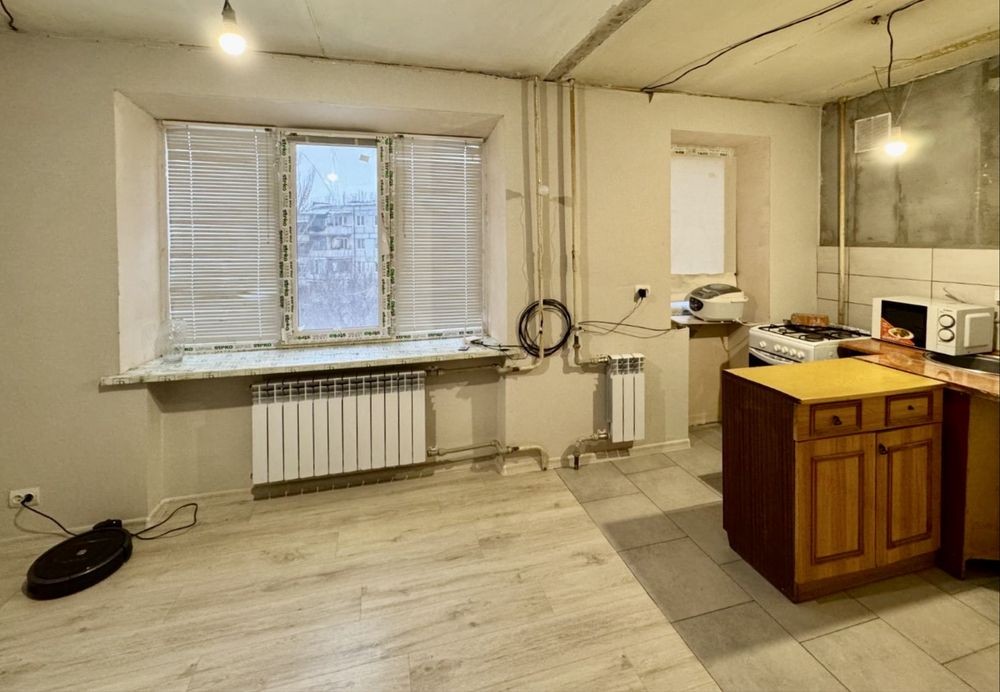 Зроблено: нова електропроводка, металопластикові вікна, батареї, підлога, сучасне планування студія.