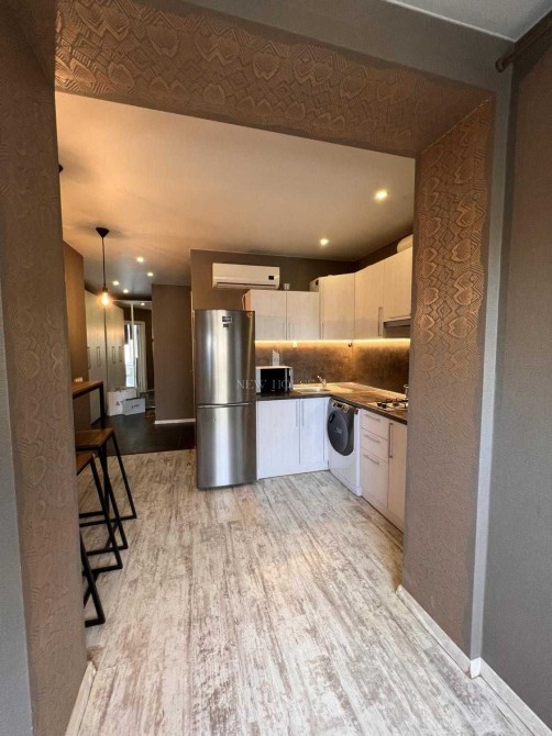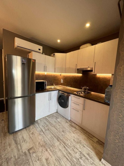 Продається з побутовою технікою: варильна панель, мікрохвильова піч, електрична духовка, холодильник, витяжка, пральна машина, кондиціонер. У квартирі є меблі та Wi-Fi.