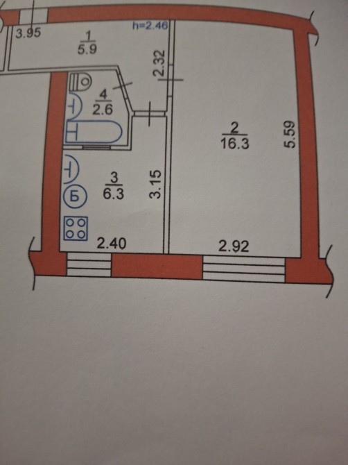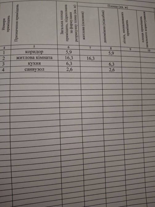 Загальна площа квартири 31 кв.м., кухня 6, кімната 16.
