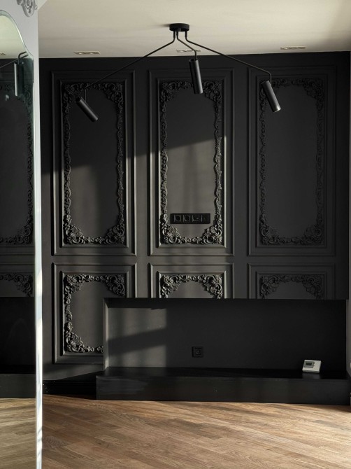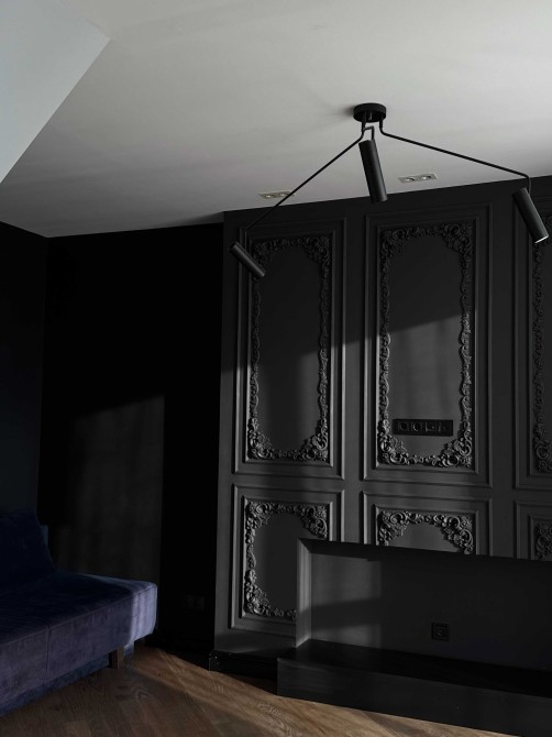 В інтер’єрі використано багато натуральних матеріалів: підлога — паркетна дошка, стеля — гіпсокартон, дерев’яні балки, гіпсова ліпнина на першому рівні. Встановлена якісна сантехніка.