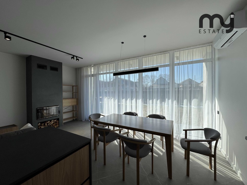 • Будинок теплий (утеплений мінеральною ватою 150 мм), опалюється електрокотлом з водяною теплою підлогою по всьому будинку у всіх зонах + як резерв дровяний камін, 4 кондиціонери.