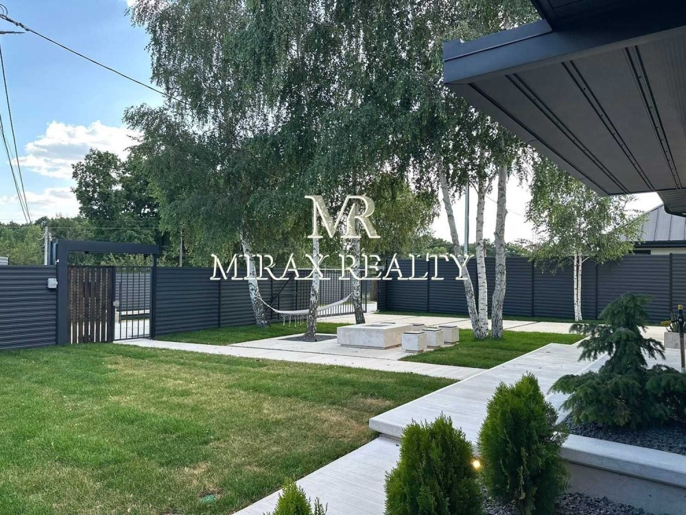 На ділянці 5 соток облаштовано зону відпочинку з вогнищем, тераса, доріжки зроблені з арт бетону, рулонний газон, відкатні ворота, парковка на 2 автомобіля, паркан по всьому периметру.