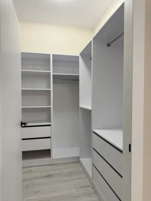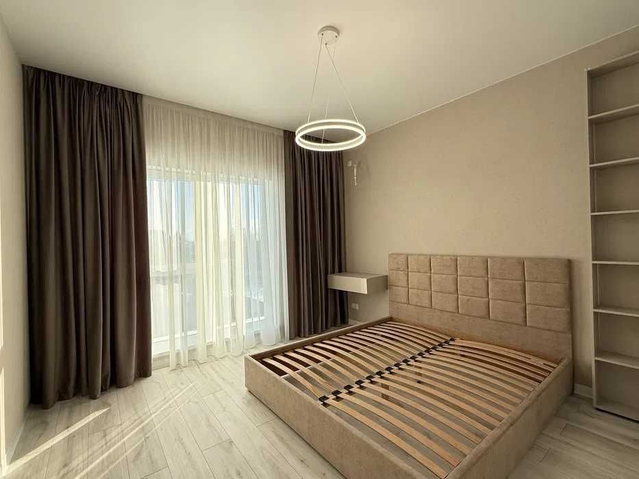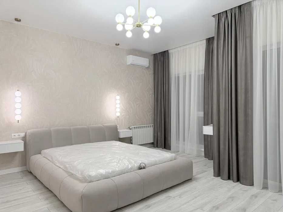 майстер-спальня: двоспальне ліжко 160*200, приліжкові підвісні тумби, підвісний мейк-ап столик із високим дзеркалом з підсвіткою. Приліжкові бра та люстра, мебльований гардероб із штангами, шухлядами та полицями для речей.