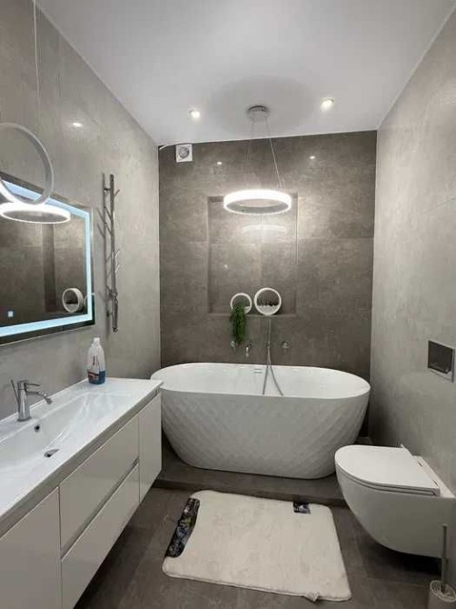 ванна 2 поверху з душовою кабіною, дзеркало в алюмінієвій рамі, підвісна тумба, точкові вологозахищені світильники та бра.