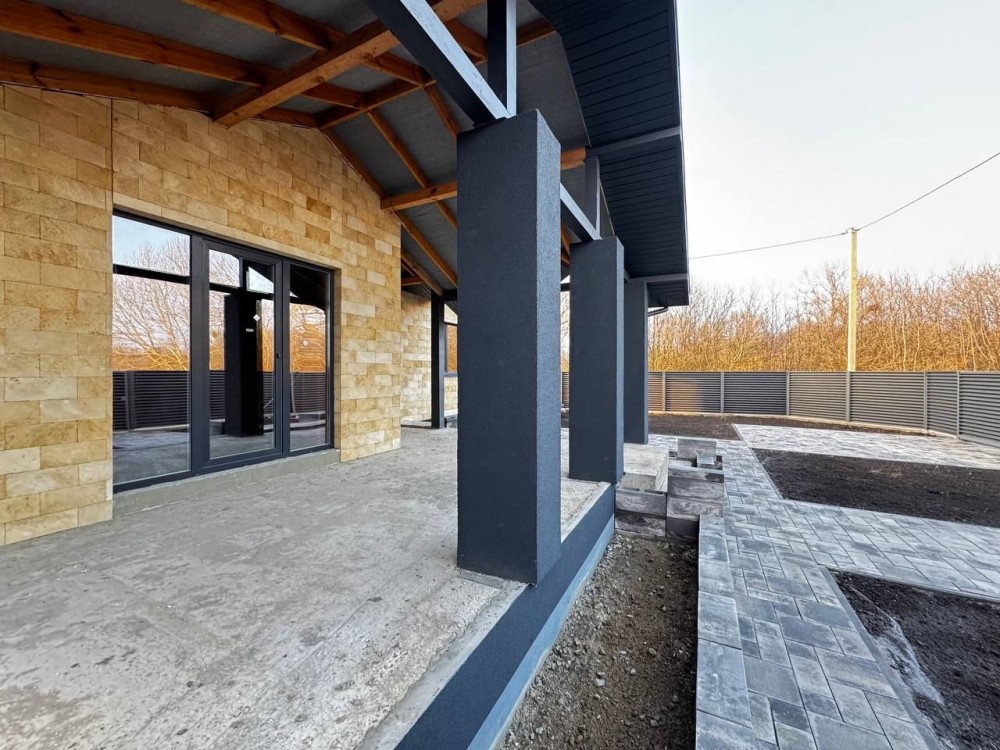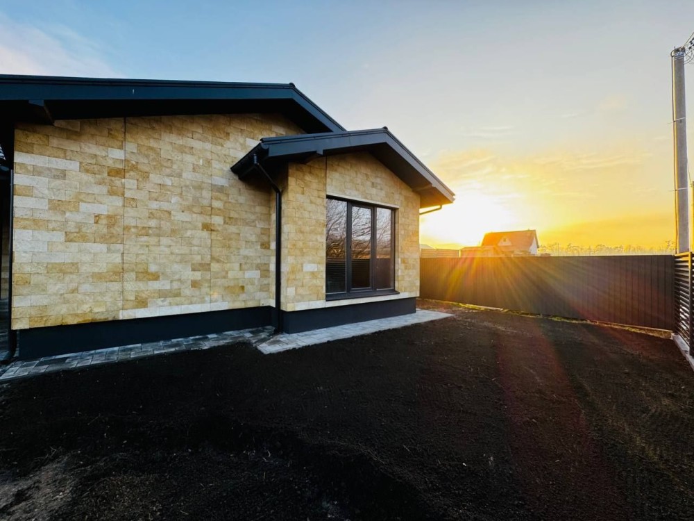 Продаж одноповерхового будинка площею 80м² плюс 5 соток землі. Простора кухня-вітальня 22.7 м² з виходом на терасу площею 22м², три кімнати.