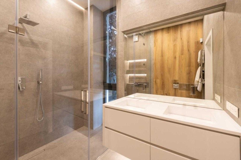 Ремонт виконувався для себе, тому використовувалися лише якісні матеріали та побутова техніка. Дизайнерський інтер’єр: натуральний камінь, італійська плитка з підігрівом, підлоги з натурального дерева, панорамні вікна, LED-освітлення. У кожній кімнаті встановлені кондиціонери.