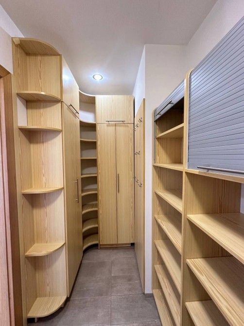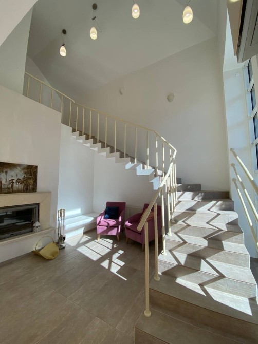 В першій частині будинку на першому поверсі коридор, велика простора кухня-вітальня площею 80 м2 з каміном та виходом на терасу, котельня-пральня, гардеробна, санвузол. На другому поверсі 2 ізольовані кімнати, гардеробна, великий санвузол з роздільною ванною та душем