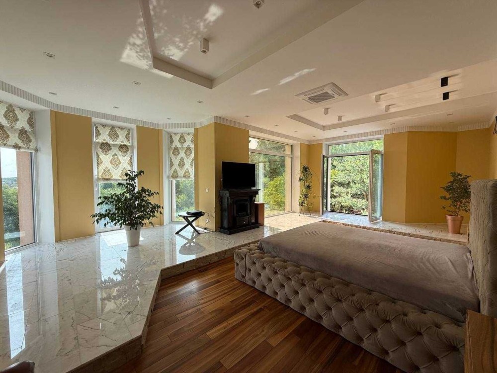 - У спальній - натуральний камін мрамур та інженерна дошка горіх, панорамні вікна