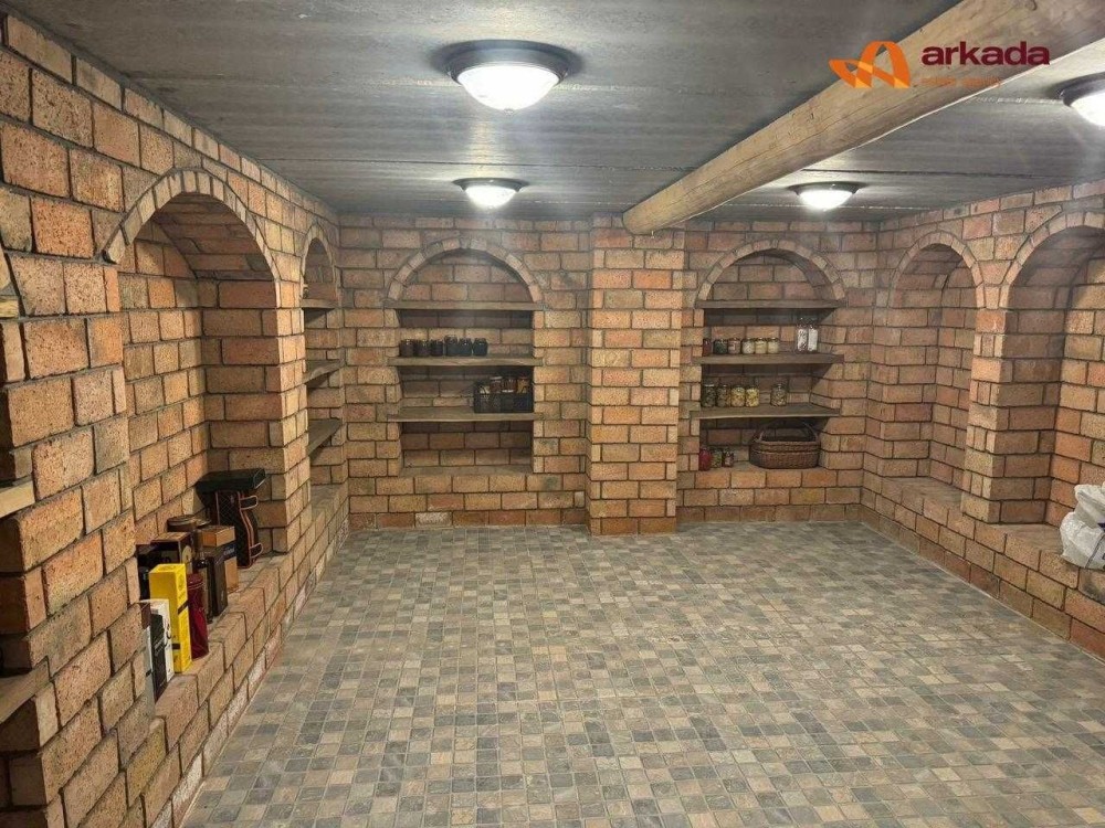 На першому поверсі розташовані простора вітальня з каміном, кухня, столова, хол, пральня, гостьовий санвузол, просторий басейн (61 м.кв ) із власним санвузлом, гараж, підвал та котельня.