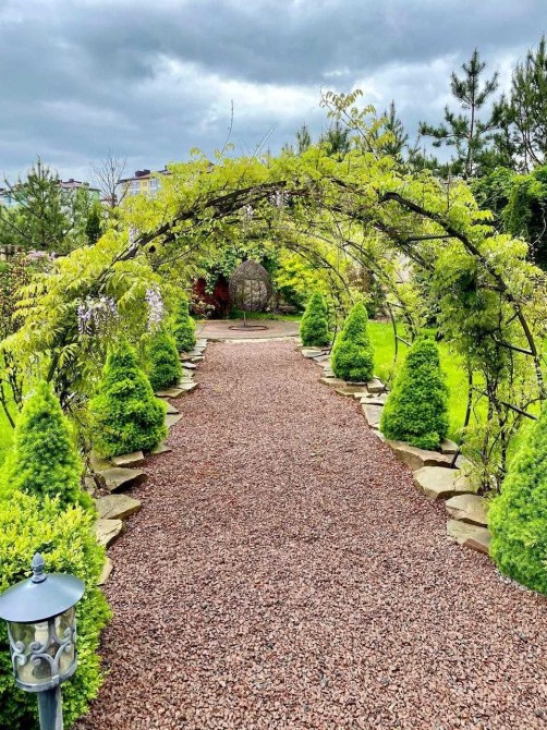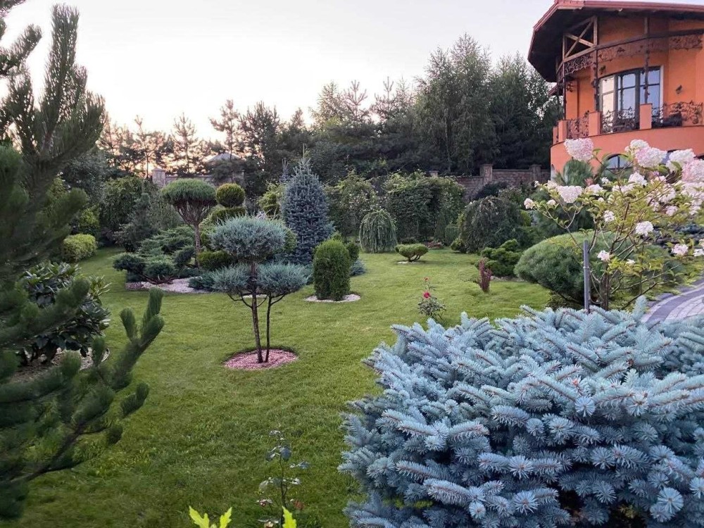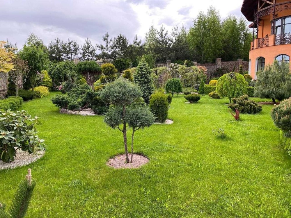Будинок розташований на великій, повністю закритій ділянці з кам’яною огорожею по периметру — територія не проглядається, що гарантує спокій та усамітнення. Асфальтований під’їзд, доріжки з бруківки, професійний ландшафтний дизайн, декоративні насадження та доглянуті клумби формують презентабельний і водночас затишний простір.