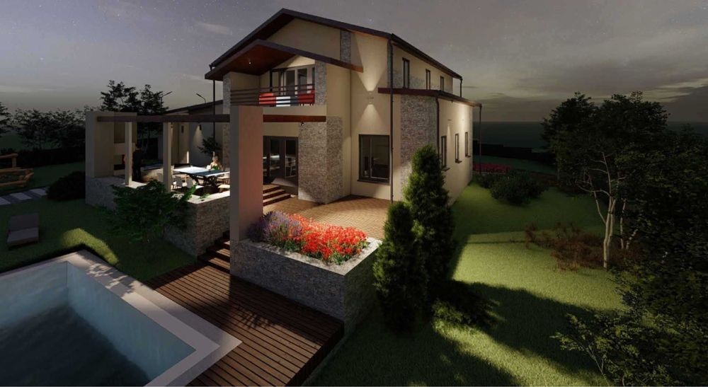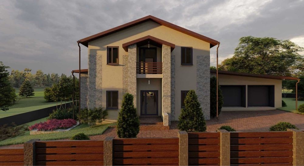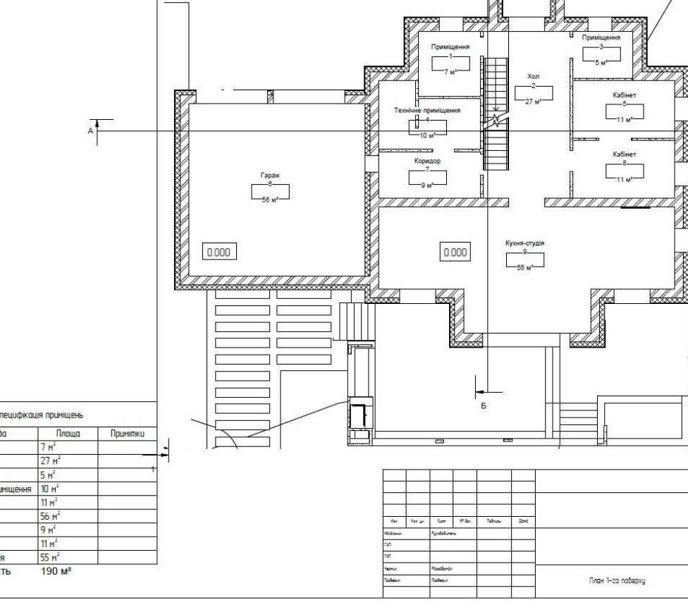 Планування: 1й поверх, гараж на 2 авто, вхідний хол, тех приміщення, с/у, гардероб, 2 невеличких кабінети або одна велика кімната, кухня вітальня, тераса.