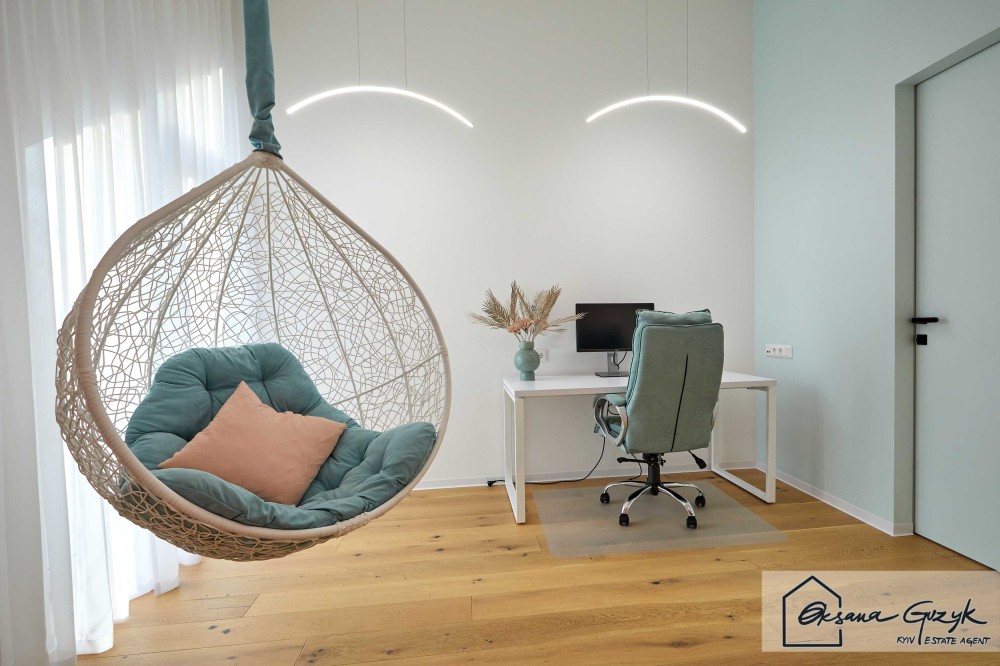 Але символом успішної кар'єри та вдалого життя є можливість іноді трохи попрацювати вдома, що надихає на нові звершення, тому у будинку реалізовано офісний простір із зоною відпочинку, великими панорамними вікнами та гарним краєвидом з них.