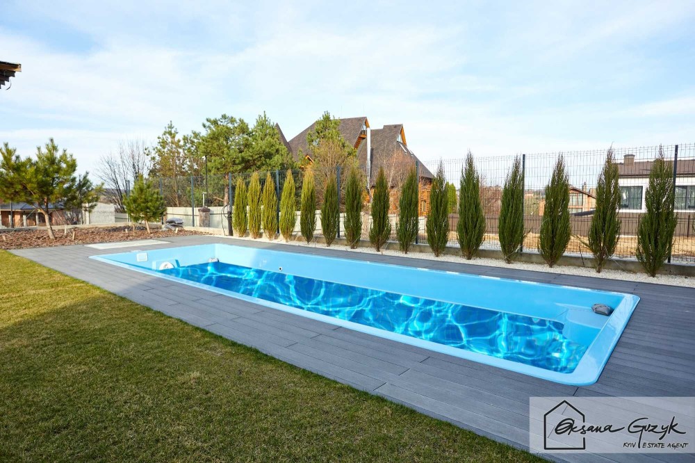 Позаду будинку розташований басейн 4*10м. з протитечією та виконаний ландшафтний дизайн із ставком та міні-річкою з водоспадом.