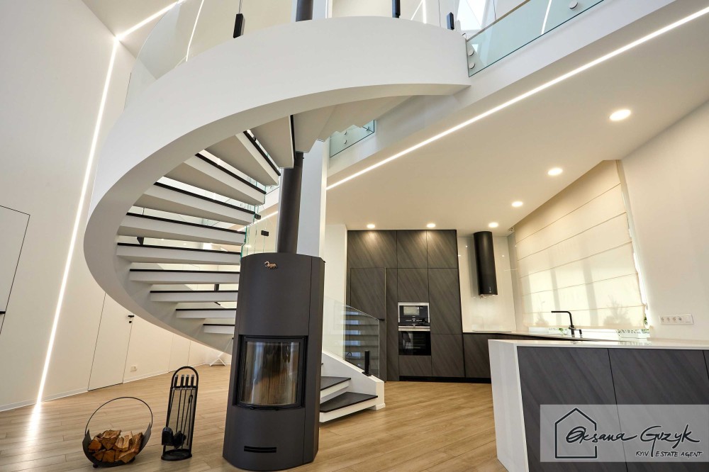 На першому поверсі, посередині будинку камін і це справжнє тепло та затишок, який розташований в центрі відкритого простору “друге світло”, посеред якого сходи, які піднімають на другий поверх. Також на першому поверсі знаходиться кімната для відпочинку та гостей з визначеним місцем для сауни та туалетом, гардеробом, пральнею, котельнею, просторою кухнею та кухонною коморою і гаражем на 2 автомобілі.