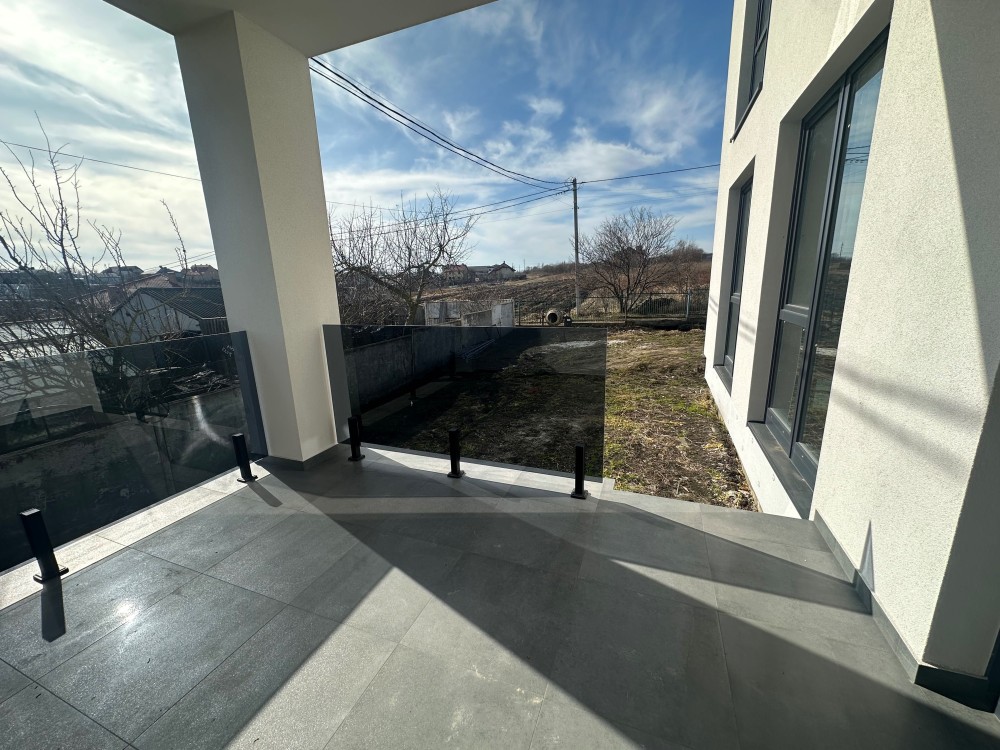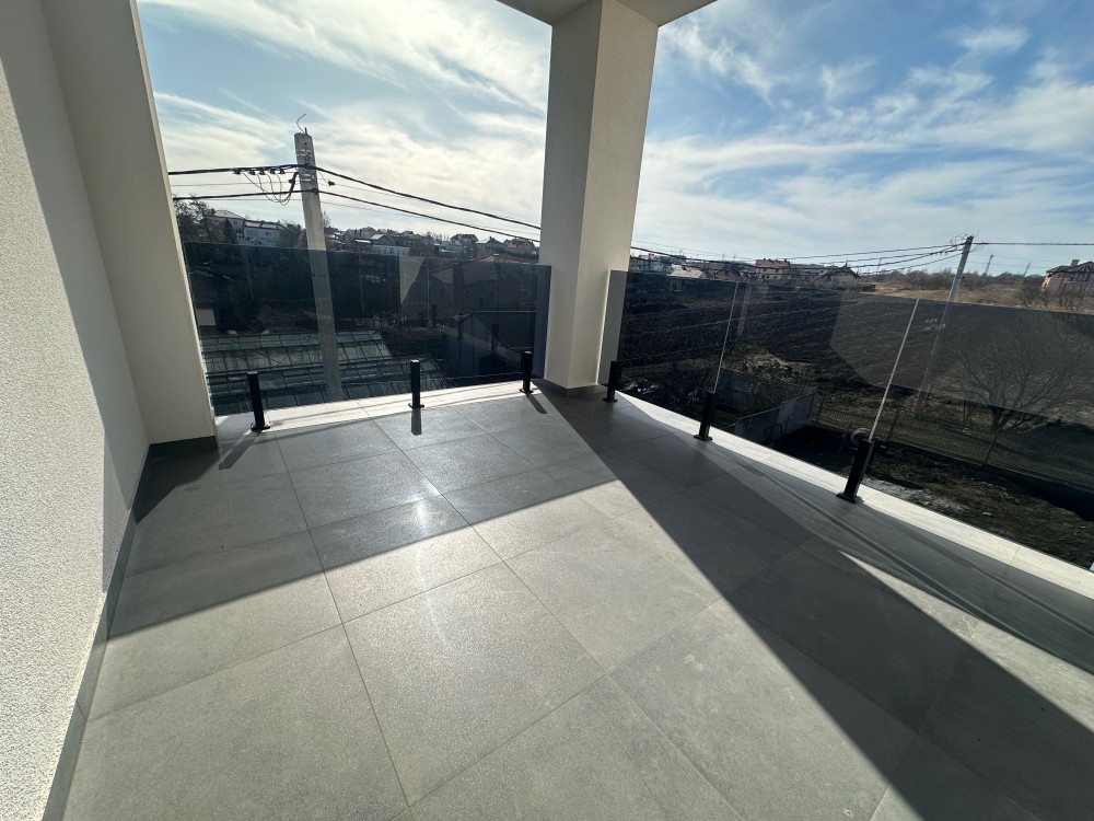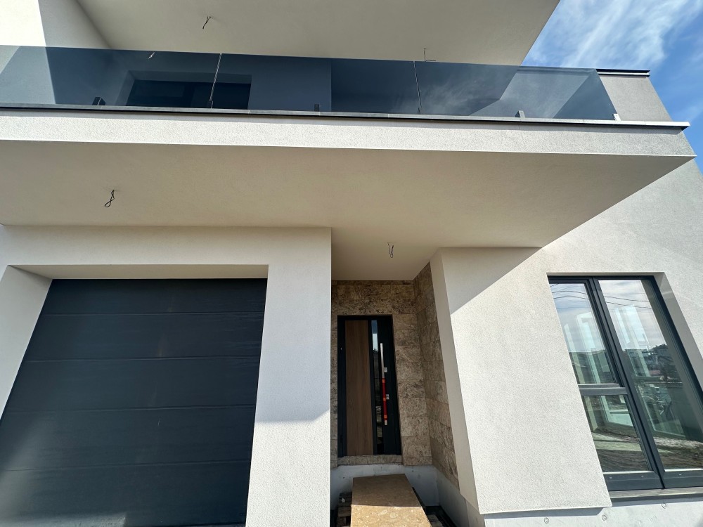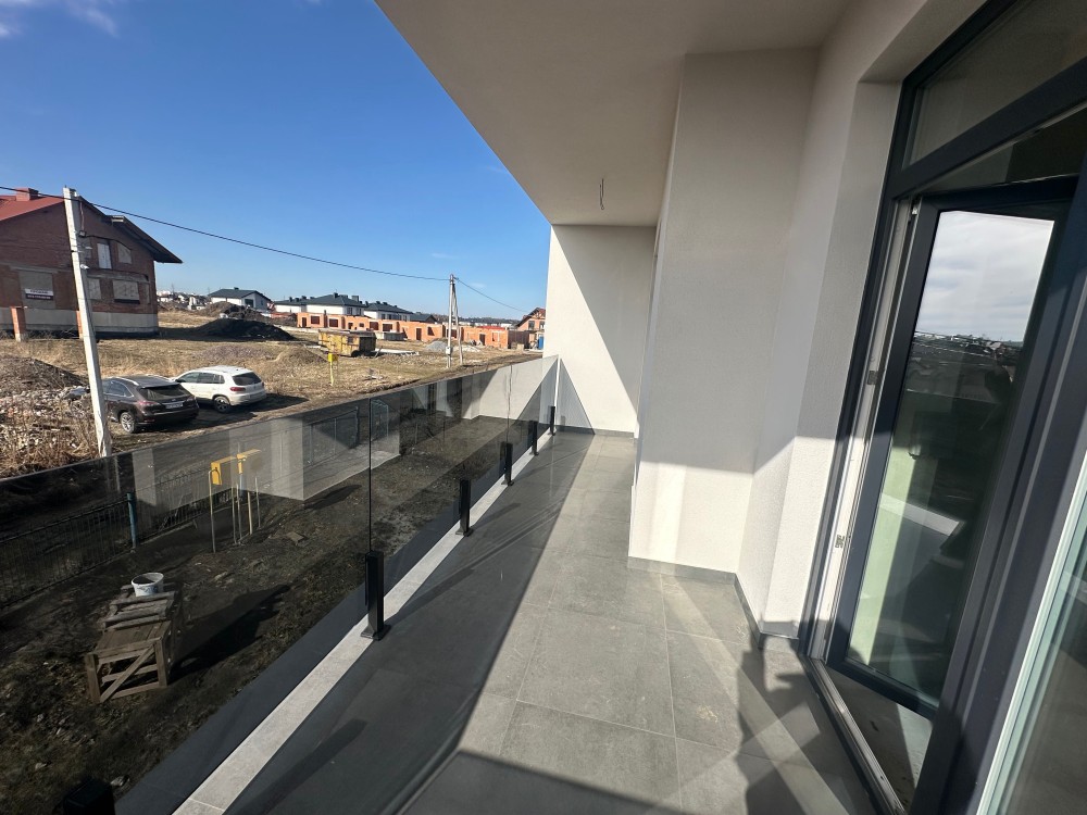 Будинок має сучасний фасад, великі балкони зі скляними огородженнями та панорамні вікна, що додають відчуття простору та комфорту.