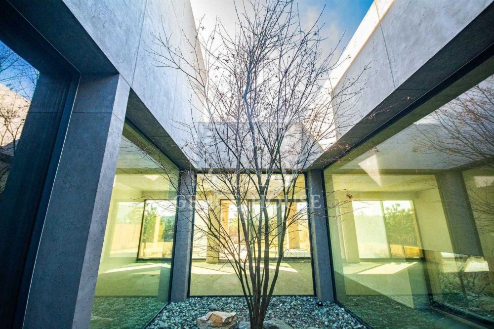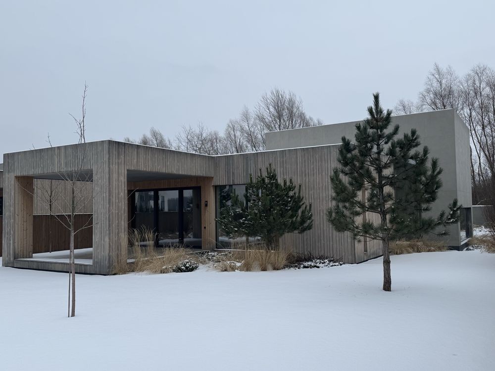 Планировка: просторная прихожая с гардеробом, открытая кухня и гостиная с панорамными окнами и выходом на террасу, мастер-спальня с собственной ванной и гардеробной, две детские комнаты, гостевой санузел, хозяйственный блок. Изюминка дома – живой канадский клен, высаженный внутри за стеклом, виден из кухни, гостиной, прихожей и ванной комнаты.