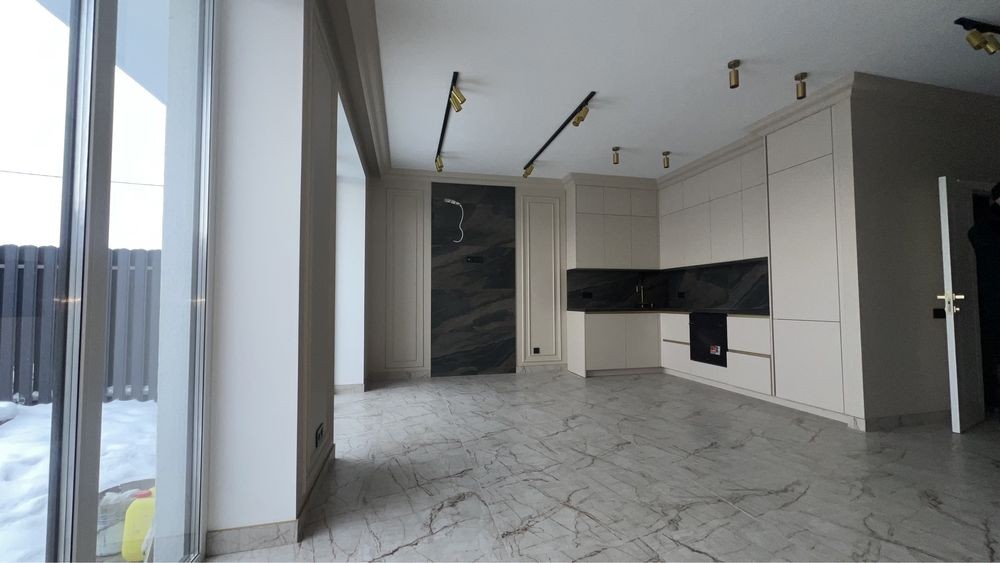 Простора кухня-вітальня з панорамними вікнами та виходом на власну терасу