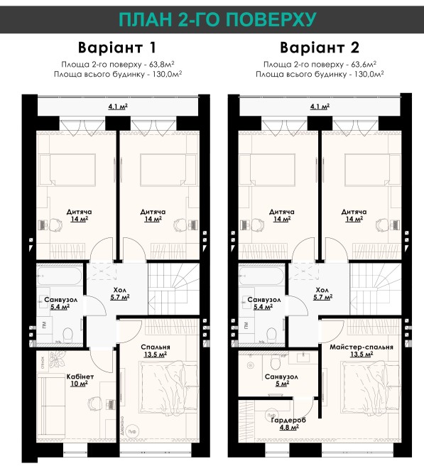 Є інший варіант планування 2-го поверху: дві спальні, санвузол і майстер-спальня з власним гардеробом і санвузлом.