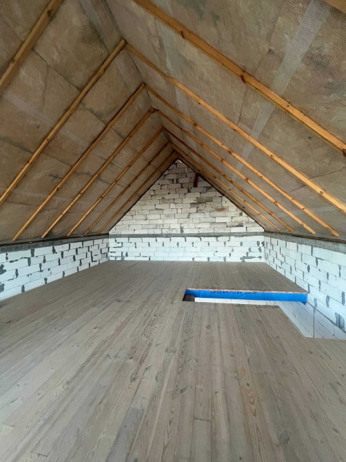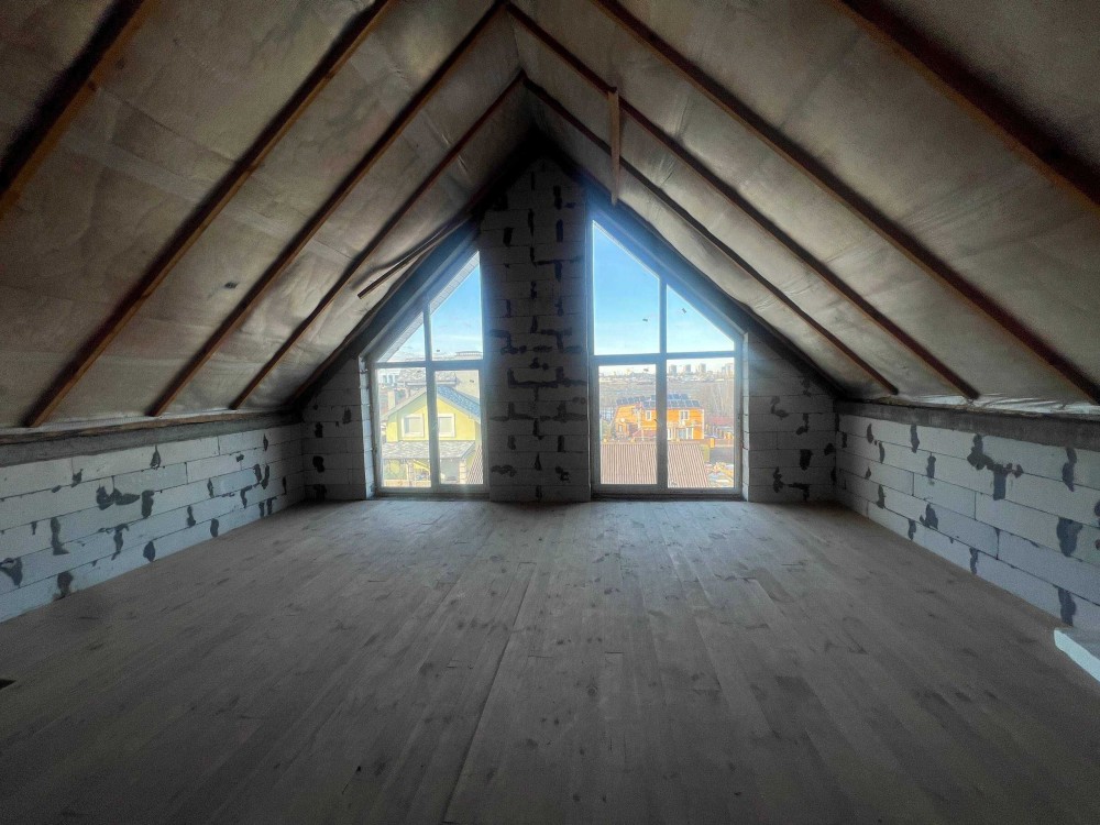 Велика мансарда без перегородок. Тут легко облаштувати домашній кінотеатр, творчу майстерню, лаунж-зону або стильну master-спальню.