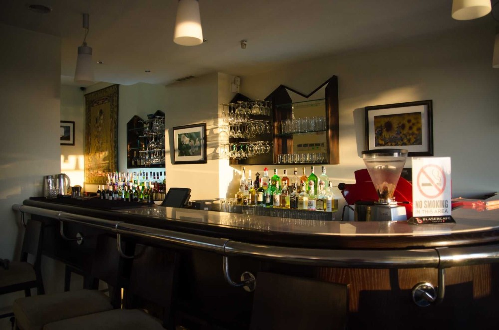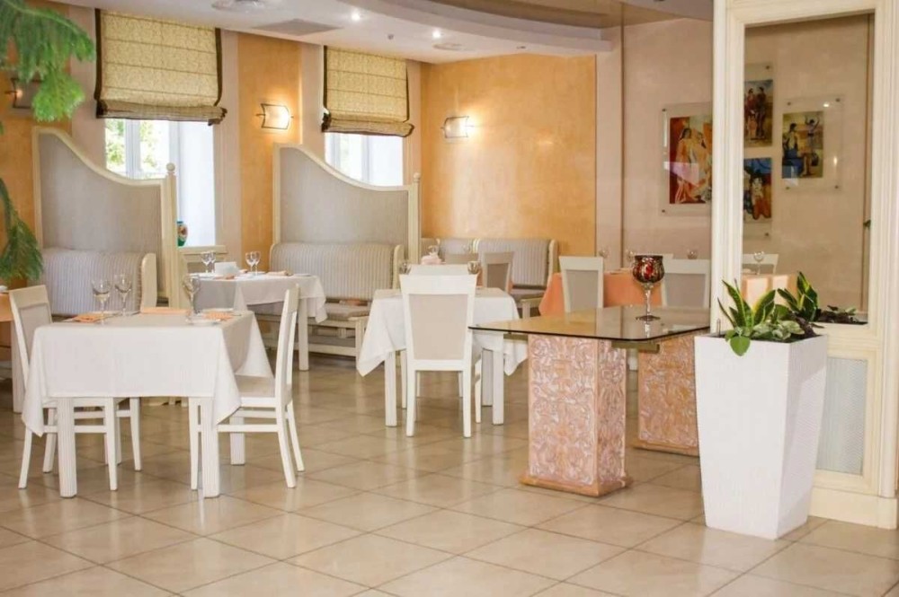 На першому поверсі розташований зал ресторану (з літнім майданчиком та банкетним залом), торгові зали, гардероб, великий вестибюль, приміщення ПАБу та кухні.