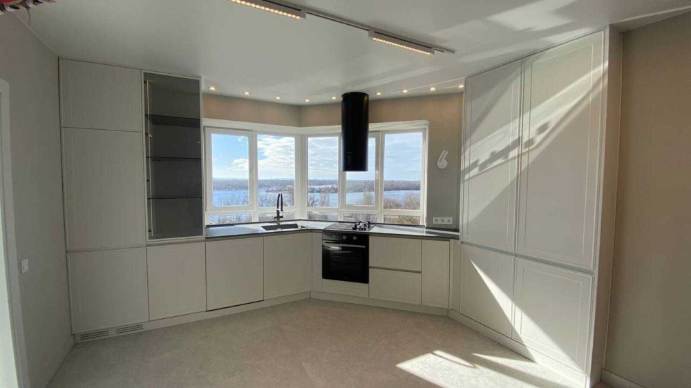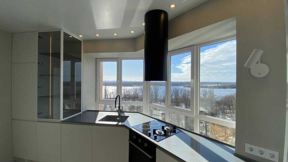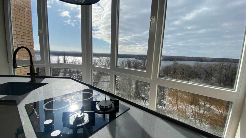 Кухонна стільниця з натурального каменю вздовж панорамного вікна — розкішне та водночас надзвичайно функціональне рішення. Ви готуєте, п’єте ранкову каву або вечеряєте, насолоджуючись відкритою панорамою на річку. Максимум світла, простору та відчуття свободи.