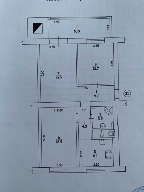 Квартира у Шевченківсьеому районі Києва. 1 поверх 5-ти поверхового будинку. Тип будинку – сталінка (червона цегла). Загальна площа 86,8 м², кухня – 8,1 м², кімнати: 19,9 м², 18,9 м² та 13,7 м². Висота стелі – 3 метри. Простора веранда – 10,9 м² (засклена). Санвузол та ванна кімнати – окремі.