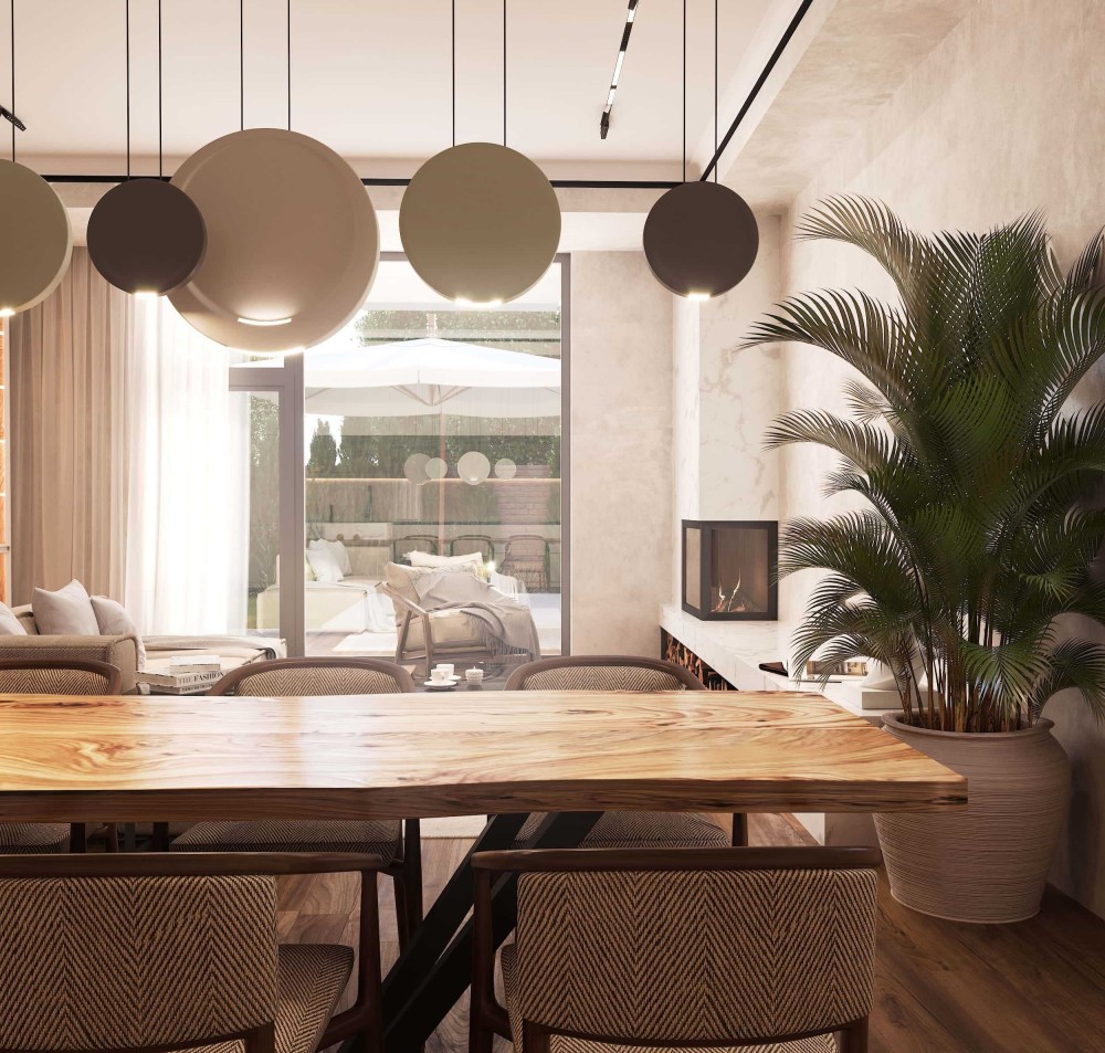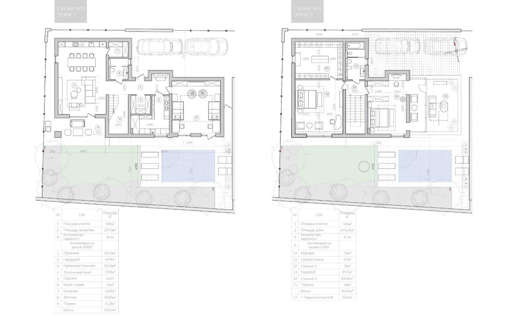 Первый этаж — большая гостиная с камином, с выходом на террасу и во двор с бассейном, кухня с кладовой, гардероб и санузел. Здесь же техническое помещение и гараж на 2 авто