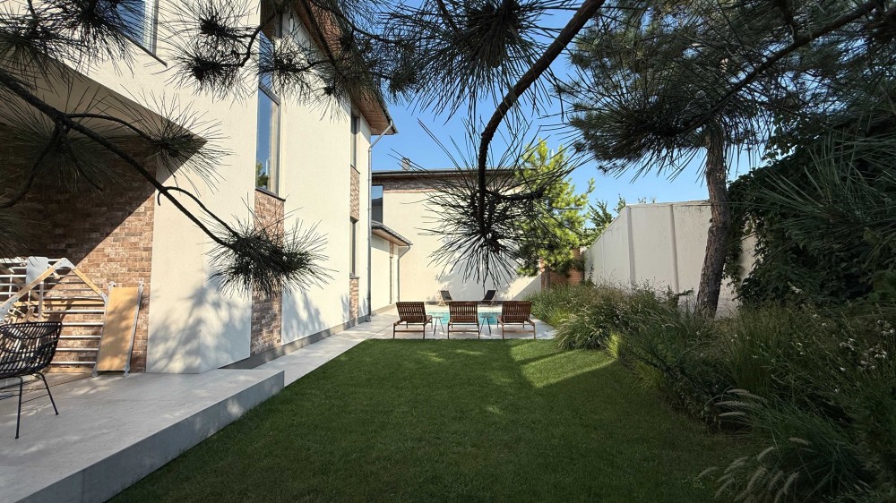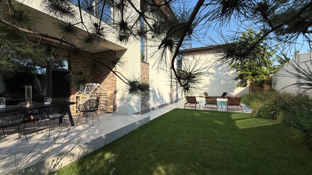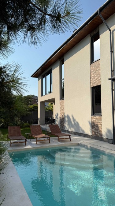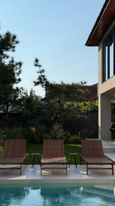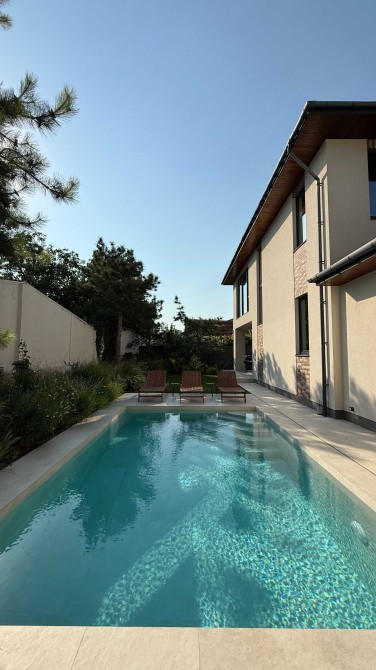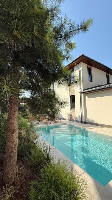 Дом площадью 247 м², построен в два этажа на 3-4 спальни, с гаражом на 2 авто, на участке в 4,2 сотки с красивым зеленым двором и с бассейном
