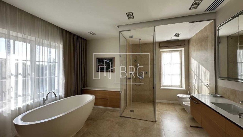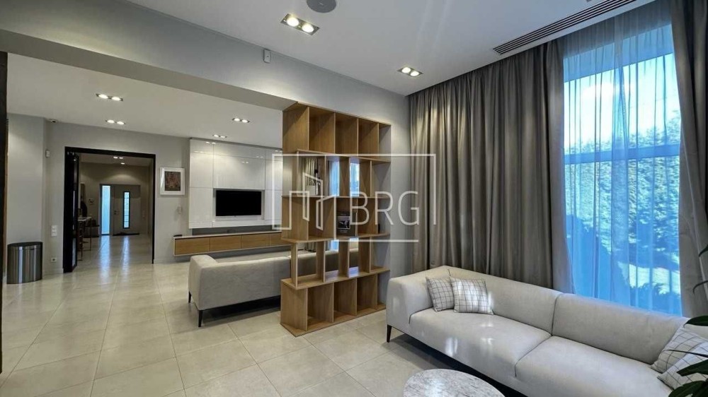Описание: Гостиная с камином, зоной столовой и кухни, 6 спален, кабинет-библиотека, кинозал, 5 с/у, подсобные помещения, отдельное крыло для персонала с кухней, гараж на 3 авто