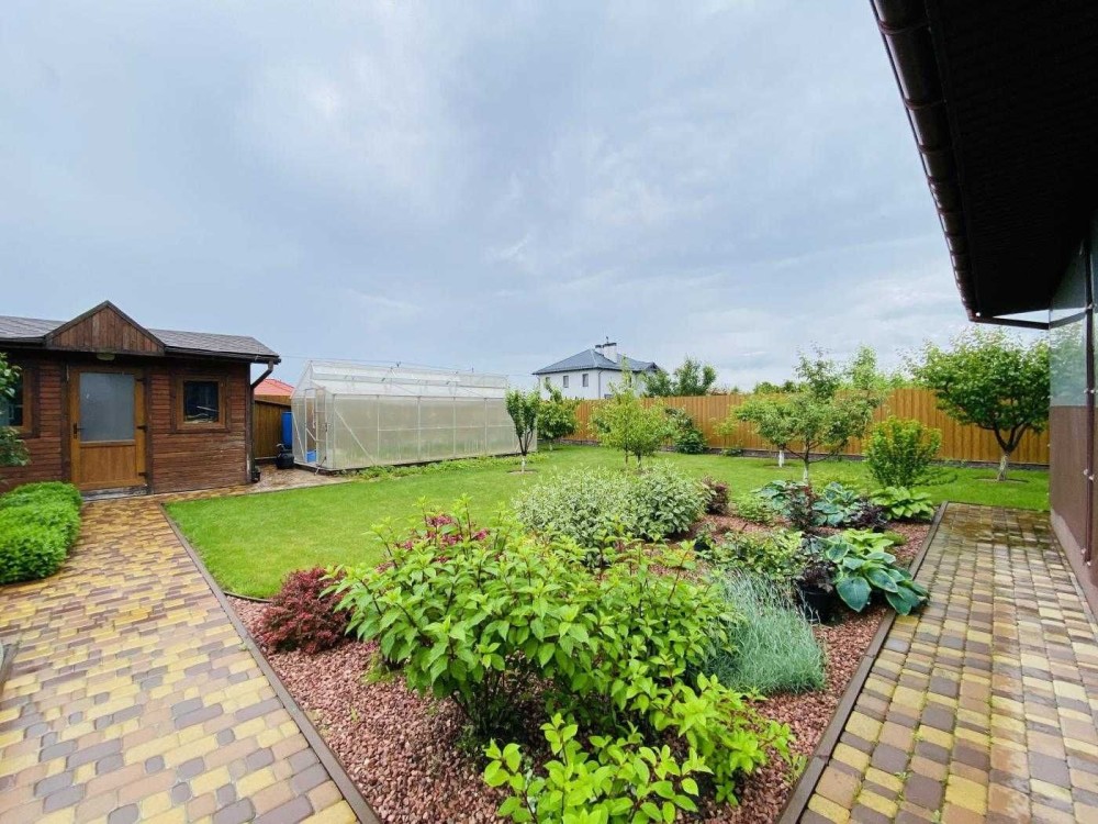 Доглянуте подвір’я з плодовими деревами, кущами і тепличкою, стоянкою для 2 автомобілів.